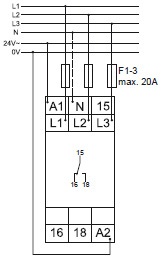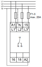 жовтий LED ON/OFF - стан релейного виходуВимірювальний ланцюг клеми (N)-L1-L2-L3 вимірювана величина 3(N)~, синус, 48...63 Гц стійкість до перевантажень 3(N)~600/346 В початковий опір 1MΩ порогові значення max: від -20% до 30% від UN