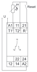 червоний LED ON/OFF - індикація перевищення температуриВимірювальний ланцюг клеми T1-T2 опір ініціалізації <1.5kΩ опір спрацьовування (реле ВИМК.) ≥3.6kΩ опір повернення (реле ВКЛ.) ≤1.8kΩ відключення ні Вхідний ланцюг Номінальна напруга Un 230 В Номінальна частота співвідв. специфікації на модуль живлення Вихідний ланцюг Кількість та тип контактів 1 CO - перекидний Номінальний струм навантаження 5 A / 250 В AC Максимальна комутована потужність 1250 В AC Дані ізоляції Номінальна ударна напруга 4000 В AC Категорія перенапруги III (відповідно до IEC 60664-1)