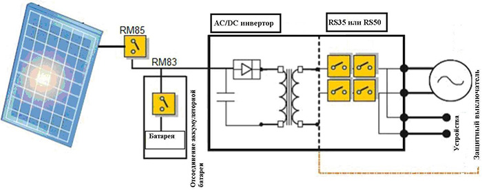 В случае необходимости разъединения линии постоянного тока, например, в целях безопасности, во время непредвиденного случая, а также для проведения испытаний или измерений, применяются реле с увеличенным зазором контактов, типов RM83 и RM85. Они также могут быть использованы для отключения батареи при её сервисном обслуживании или при калибровке угла наклона солнечных батарей.