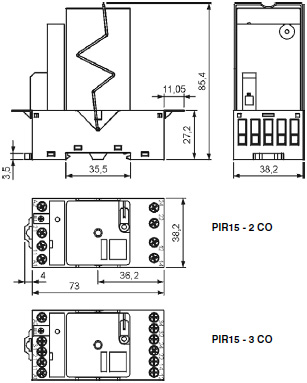 Реле PIR15...T призначені для безпосереднього монтажу на ДИН-рейці 35 мм відповідно до PN-EN 60715 або на панелі за допомогою 2 болтів М3. Підключення: макс. переріз монтажного дроту: 2 x 1,5 мм 2 (2 x 14 AWG), довжина зачищеної ділянки монтажного дроту: 6,5 мм, макс. момент затягування монтажного затиску: 0,5 Нм.