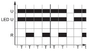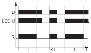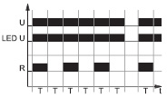 Після включення напруги живлення U відразу відбувається спрацювання виконавчого реле R та відлік встановленого часу Т. Після відліку часу Т виконавче реле R повертається у початковий стан.