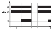 Після включення напруги живлення U починається відлік встановленого часу Т, з одночасним включенням виконавчого реле R. Після відліку часу Т, виконавче реле R повертається у початковий стан і починається повторний відлік часу Т. Після відліку часу Т, починається наступний цикл роботи реле . Робота реле триває до вимкнення напруги живлення.