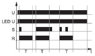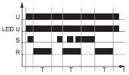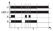 U - напруга живлення; R - стан виходу реле; S - стан керуючого контакту; T - час, що відраховується; t - вісь часу
