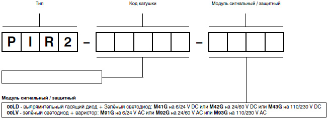 - Інтерфейсне реле PIR2 з колодкою GZM2 складається з: електромагнітне реле R2, сіра контактна колодка GZM2, модуль сигнальний / захисний: виконання LD - M41G або M42G або M43G (L - LED зелений, D - гасить діод, поляризація N: +A1 /-A2); виконання LV - M91G або M92G або M93G (L - LED зелений, V - варистор), кліпса-виштовхувач GZT4-0040 (пластик), білий шильдик для маркування GZT4-0035