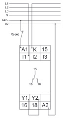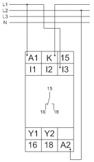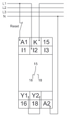 Якщо вимірювана напруга стане менше значення на MIN-регулювальнику, почнеться відлік затримки спрацьовування DELAY (червоний LED MIN блимає). Після завершення затримки спрацьовування (червоний LED MIN горить), вихідне реле переключиться у стан ВИМК. (жовтий LED не горить). Вихідне реле знову переключиться у стан ВКЛ. (жовтий LED горить), коли напруга, що вимірюється, перевищить значення на MAX-регуляторі. Якщо активована функція клямки (міст Y1-Y2) і вимірювана напруга була нижчою за MIN-значення довше ніж затримка спрацьовування, вихідне реле залишиться у співвідношенні ВИМК. навіть якщо напруга, що вимірюється, перевищить значення на MAX-регуляторі. Після скидання (відключення та ввімкнення знову напруги живлення), вихідне реле переключиться у стан ВКЛ. і розпочнеться новий цикл вимірювання, починаючи з відліку затримки включення (START).