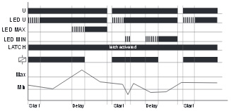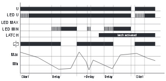 Якщо вимірювана напруга перевищить значення MAX-регулятора, почнеться відлік затримки спрацьовування DELAY (червоний LED MAX блимає). Після завершення затримки спрацьовування (червоний LED MAX горить), вихідне реле переключиться у стан ВИМК. (жовтий LED не горить). Вихідне реле знову переключиться у стан ВКЛ. (жовтий LED горить), якщо вимірювана напруга стане менше значення на MIN-регуляторі (червоний LED MAX не горить). Якщо активована функція клямки (міст Y1-Y2) і вимірювана напруга перевищить MAX-значення, довше ніж затримка спрацьовування, вихідне реле залишиться в стані ВИМК., навіть якщо вимірювана напруга стане менше значення на MIN-регуляторі. Після скидання (відключення та ввімкнення знову напруги живлення), вихідне реле переключиться у стан ВКЛ. і розпочнеться новий цикл вимірювання, починаючи з відліку затримки включення (START).