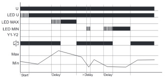 При подачі напруги живлення U, вихідне реле переключиться у стан ВКЛ. (жовтий LED горить) і почнеться відлік затримки увімкнення START (зелений LED U блимає). Зміни вимірюваної напруги протягом цього періоду не вплинуть на стан вихідного реле. По завершенні затримки включення зелений LED горить постійно. У всіх режимах роботи LEDs MIN і MAX блимають поперемінно, якщо уставка мінімуму більша від уставки максимуму.