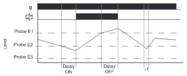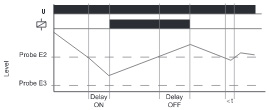 Підключення датчиків E2 та E3 (E1-E3 з'єднуються перемичкою). Замість датчика E3 може бути підключений корпус резервуара (у разі, якщо він проводить електричний струм). Якщо рівень провідної рідини досягне датчика E2, починається відлік затримки спрацьовування (Delay ON). Після закінчення цього інтервалу вихідне реле R перемикається в положення ВКЛ. (Жовтий LED горить). Коли рівень провідної рідини опускається нижче датчика E2, починається відлік затримки вимкнення (Delay OFF). Після закінчення затримки вимкнення вихідне реле R перемикається у положення ВИМК. (Жовтий LED не світиться).