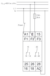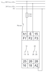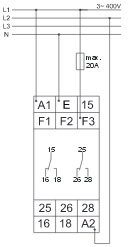 червоний LED блимає - індикація відліку затримки спрацьовування за відповідним порогомВимірювальний ланцюг клеми E-F3(+) форма сигналу DC або AC, синус, 16,6...400 Гц перевантажувальна здатність 440Vrms початковий опір 470kΩ порогові значення max: від 10% до 100% від UN