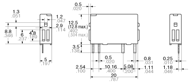 Дані контактів Кількість та тип контактів 1 NO Матеріал контактів AgNi Номінальний струм навантаження 5 A / 250 В AC 5 A / 30 В DC Максимальна комутована напруга 250 В AC Максимальна комутована потужність 1250 ВA Максимальний комутований струм 5 A Опір контакту < 30 мΩ Дані котушки Номінальна напруга 5 ... 24 В DC Номінальна споживана потужність 0,12 Вт (від 5 до 18 В DC), 0,18 Вт (24 В DC) Дані ізоляції Номінальна напруга ізоляції 500 В DC Номінальна ударна напруга 4000 В Напруга пробою між котушкою та контактами 2000 В між струмовводами 1000 В Додаткові дані Механічний ресурс > 2 x 107 Електричний ресурс > 105 (3 A / 250 В AC, 30 В DC, резистивне навантаження) Температура навколишнього середовища для роботи -40...+70°C