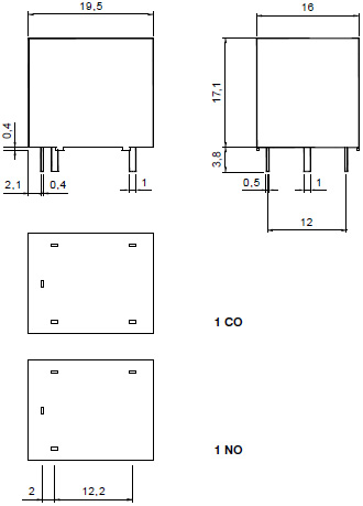 1 NO: 20 A / 125 В AC1 CO: 10 A / 7 A (NO/NC) / 30 В DC 1 NO: 10 A / 30 В DC Максимальна комутована напруга 277 В AC Максимальна комутована потужність 3000 ВA Максимальний комутований струм 10 А Опір контакту < 100 мΩ Дані котушки Номінальна напруга 5 ... 48 В DC Номінальна споживана потужність 0,36 Вт DC Дані ізоляції Напруга пробою між котушкою та контактами 2500 В AC контактного зазору 1000 В AC Додаткові дані Механічний ресурс 107 Електричний ресурс 105 1 CO: 10 A / 7 A (NO/NC), 250 В AC 1 NO: 10 A, 250 В AC 105 1 CO: 10 A / 7 A (NO/NC), DC 30 В 1 NO: 10 A, DC 30 В Температура навколишнього середовища для роботи -40...+85 °C