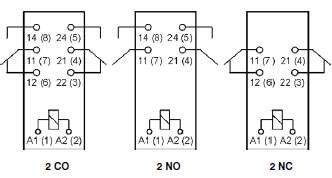Дані контактів Кількість та тип контактів 2 CO, 2 NO, 2 NC Матеріал контактів AgCu/Au 0,2 µm, AgCdO, AgCdO/Au 3 µm Номінальний струм навантаження 8 A / 250 В AC 8 A / 24 В DC Максимальна комутована напруга 440 В AC Максимальна комутована потужність 2000 ВA Максимальний комутований струм 8 A Опір контакту < 100 мΩ Дані котушки Номінальна напруга 6 ... 110 В DC - стандартне виконання