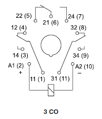 Дані контактів Кількість та тип контактів 3 CO Матеріал контактів AgNi, AgNi/Au 0,2 µm, AgNi/Au 5 µm Номінальний струм навантаження 10 A / 250 В AC, 10 A / 277 В AC UL 508 10 A / 24 В DC Максимальна комутована напруга 440 В AC Максимальна комутована потужність 2 500 ВA Максимальний комутований струм 10 A Опір контакту < 100 мΩ Дані котушки Номінальна напруга 6 ... 240 В AC 50/60 Гц 6 ... 220 В DC Номінальна споживана потужність AC: 2,8 ВA 50 Гц, 2,5 ВA 60 Гц DC: 1,5 Вт Дані ізоляції Напруга пробою між котушкою та контактами 2 500 В AC контактного зазору 1 500 В AC між струмовводами 2 000 В AC Додаткові дані Механічний ресурс > 2 x 105 10 A, 250 В AC Електричний ресурс > 2 x 107 Температура навколишнього середовища для роботи AC: -40...+55 °C DC: -40...+70 °C