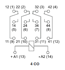 Для реле с катушками DC и дополнительным оснащением, охватывающим: D - элемент ограничения перенапряжения (диод) и L - индикатор срабатывания, световой (светодиод) следует соблюдать установленное направление питания катушки . Вывод А 1 (13) ” + ” ; вывод А 2 (14) ” - ” . Направление питания обозначено на корпусе реле. Цвет внешней тест - кнопки, с функцией блокировки типа Т показывает тип тока питания катушки: оранжевый - катушка АС, морской - катушка DC.