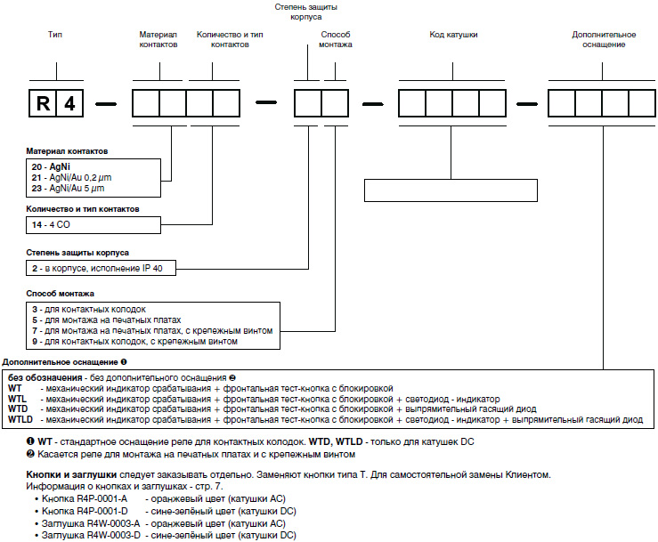 - стандартний WT (механічний індикатор спрацьовування з фронтальною тест-кнопкою з блокуванням), для монтажу в контактних колодках. У стандартному виконанні реле (WT) існує можливість самостійної заміни кнопки типу Т на кнопку типу R4P-0001 без функції блокування контактів або заглушку R4W-0003, що виключає функції тесту та блокування контактів. Кнопки типу Р та заглушки слід замовляти окремо