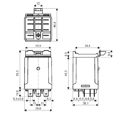 - з вертикальними адаптерами (V) або горизонтальними (Н) для безпосереднього монтажу на рейці 35 мм відповідно до PN-EN 60715, плоскі роз'єми FASTON 187 (4,8 х 0,5 мм) або FASTON 250 (6,3 х 0,8 мм)