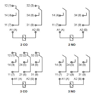 Дані контактів Кількість та тип контактів 2 CO, 3 CO, 2 NO, 3 NO 2 NO, 3 NO з контактним зазором > 3 мм Материал контактов AgCdO, AgNi Номінальний струм навантаження 16 A / 250 В AC або 10 А / 400 В AC 16 A / 250 В AC 16 A / 24 В AC Максимальна комутована напруга 440 В AC 250 В AC Максимальна комутована потужність 4 000 ВA Максимальний комутований струм 40 A Опір контакту < 100 мΩ Дані котушки Номінальна напруга 6 ... 240 В AC 50,60 Гц 400 В AC 50 Гц 6 ... 220 В DC Номинальная потребляемая мощность AC: 2,8 ВA 50 Гц AC: 2,5 ВA 60 Гц DC: 1,5 Вт DC: 1,7 Вт з контактним зазором > 3 мм Дані ізоляції Напруга пробою між котушкою та контактами 2500 В AC контактного зазора 1500 В AC 2500 В AC з контактним зазором > 3 мм між струмовводами 2500 В AC Додаткові дані Механічний ресурс > 107 Електричний ресурс > 105 16 A, 250 В AC > 105 10 A, 400 В AC Температура навколишнього середовища для роботи AC: -40...+55 °C 3 CO, 3 NO / 16 A