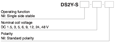 Код котушки Номінальна напруга В DC Опір котушки при 20 °C Ω Допуск опору Робочий діапазон напруги живлення В DC мін. (при 20 °C) макс. (при 50 °C) DC1.5V 1,5 11,3 ± 10% 1,05 3 DC3V 3 45 ± 10% 2,1 6 DC5V 5 125 ± 10% 3,5 10 DC6V 6 180 ± 10% 4,2 12 DC9V 9 405 ± 10% 6,3 18 DC12V 12 720 ± 10% 8,4 24 DC24V 24 2 880 ± 10% 16,8 48 DC48V 48 7 680 ± 10% 33,6 96