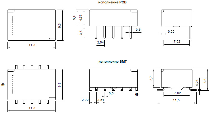 0,20 Вт - 24 В DCДані ізоляції Напруга пробою між котушкою та контактами 1000 В AC контактного зазору 1000 В AC між струмовводами 1000 В AC Додаткові дані Механічний ресурс 108 Електричний ресурс 105 0,5 A, 125 В AC Температура навколишнього середовища для роботи PCB: -40...+70 °C