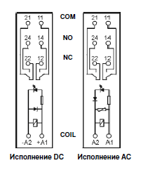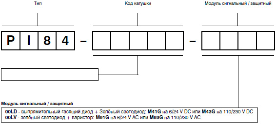 - Інтерфейсне реле PI84 з колодкою GZM80 складається з: електромагнітне реле RM84, сіра контактна колодка GZM80, модуль сигнальний / захисний: виконання LD - M41G або M43G (L - LED зелений, D - діод, що гасить, поляризація N: +A1/- A2); виконання LV-M91G або M93G (L-LED зелений, V-варістор), кліпса-виштовхувач GZT80-0040 (пластик), білий шильдик для маркування GZT80-0035