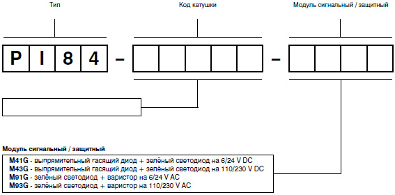 - Інтерфейсне реле PI84 з колодкою GZT80 складається з: електромагнітне реле RM84, сіра контактна колодка GZT80, модуль сигнальний / захисний: виконання LD - M41G або M43G (L - LED зелений, D - діод, що гасить, поляризація N: +A1/- A2); виконання LV-M91G або M93G (L-LED зелений, V-варістор), кліпса-виштовхувач GZT80-0040 (пластик), білий шильдик для маркування GZT80-0035