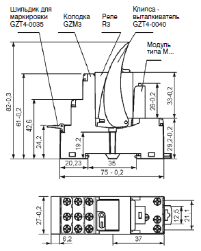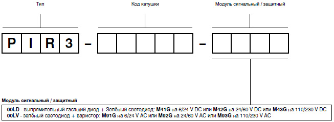 - Інтерфейсне реле PIR3 з колодкою GZM3 складається з: електромагнітне реле R3, сіра контактна колодка GZM3, модуль сигнальний / захисний: виконання LD - M41G або M42G або M43G (L - LED зелений, D - діод, що гасить, поляризація N: +A1 /-A2); виконання LV - M91G або M92G або M93G (L - LED зелений, V - варистор), кліпса-виштовхувач GZT4-0040 (пластик), білий шильдик для маркування GZT4-0035