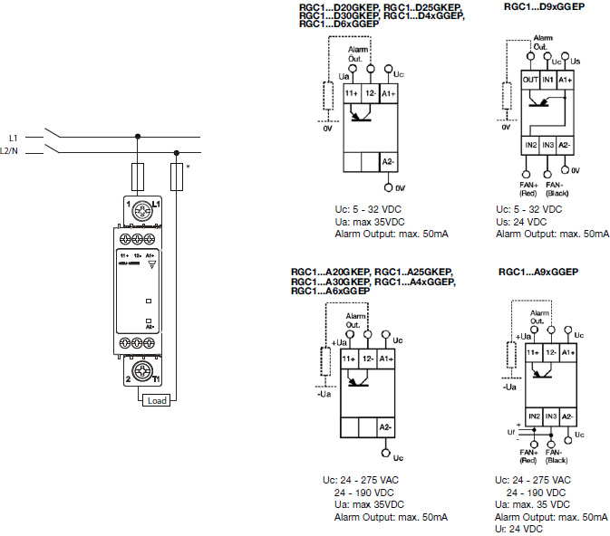 Розташування клем та габаритні розміри - RGС...90GGEP, RGС...92GGEP